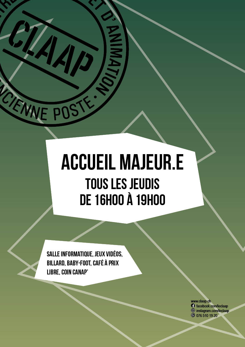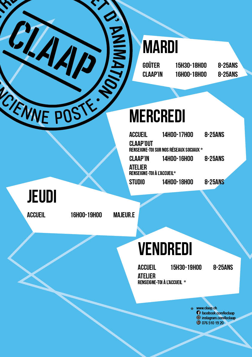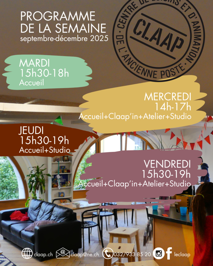Nous menons actuellement une réflexion de fond sur le site internet du CLAAP. Il se peut donc que certaines fonctionnalités et certaines informations soient obsolètes et nous nous en excusons. Nous espérons pouvoir le mettre à jour rapidement. En cas de question, n’hésitez pas à nous contacter par mail à claap@ne.ch . Vous pouvez toujours nous suivre sur les réseaux sociaux! Merci pour votre compréhension!